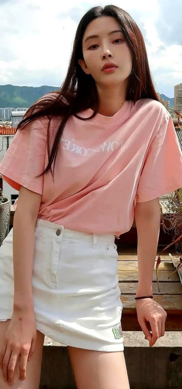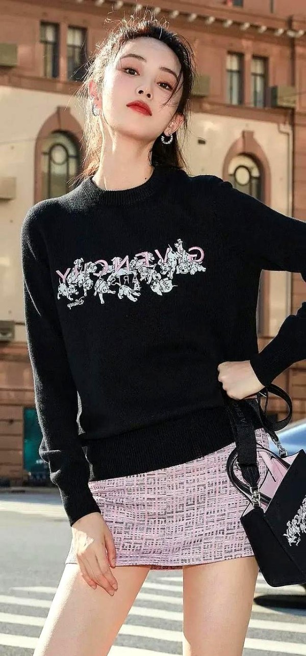 穿黑毛衣配短裙,大长腿很吸睛;穿粉色T恤配白短裙,小蛮腰也藏不住。