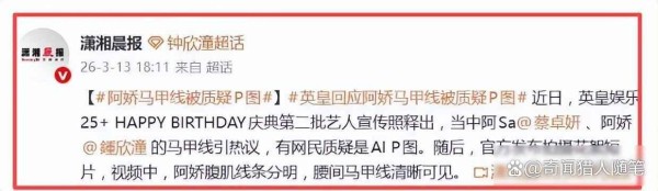 2026年3月初,英皇娱乐发了一张组合25周年的宣传照,阿娇穿着露腹装站在中间,腰腹线条特别清晰,就像用尺子画出来一样,结果评论区没人夸她好看,反而一堆人问这腹肌是不是P的,说边缘太整齐了不像真人,有人还截图放大看光影过渡,觉得AI生成痕迹明显,奇怪的是同框的阿Sa没人质疑,焦点全落在阿娇身上。