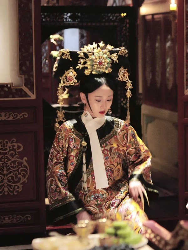 先说最吸睛的高贵妃,那身正红宫装简直是行走的火焰!从旗头的红宝石流苏到裙摆的金线刺绣,连耳环都是鸽血红的水滴形,生怕别人不知道她是皇上心尖上的人。可你仔细看,她领口那圈白狐毛边,跟太后同款珍珠项链一比,反倒显得有点用力过猛——就像把“宠妃”身份穿成了战袍,美得张扬却少了点沉稳。 再看如懿,一身墨绿暗纹旗袍配同色系旗头,偏偏戴了条翡翠项链。这抹绿在满屋子的红黄里特别扎眼,却又透着股“不争不抢”的劲儿。后来才知道,这绿项链是她当格格时的旧物,故意戴出来示弱呢!毕竟刚入宫根基不稳,太高调容易成靶子。不过这招“以退为进”确实聪明,连太后都多看了她两眼。