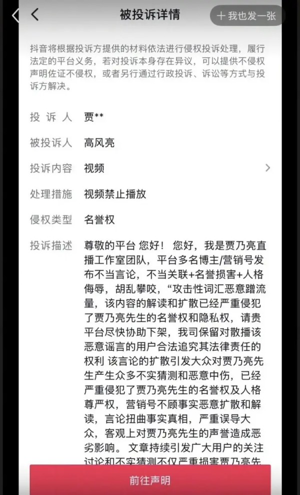 起因是有一个叫“高风亮”的抖博主模仿pgone拍视频,引发了网友的关注,然后贾乃亮工作室就以“名誉权”为由下场举报该博主,把对方的几个视频搞下架了。