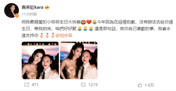 祝我最亲爱的小菲菲生日大快乐,今年因为在组里拍戏,没有办法去给你过生日,等我拍完,咱们好好聚聚,还是那句话,做你自己喜欢的事,我会永远支持你。