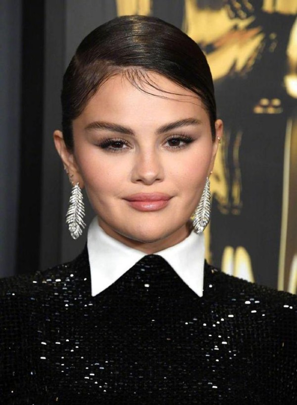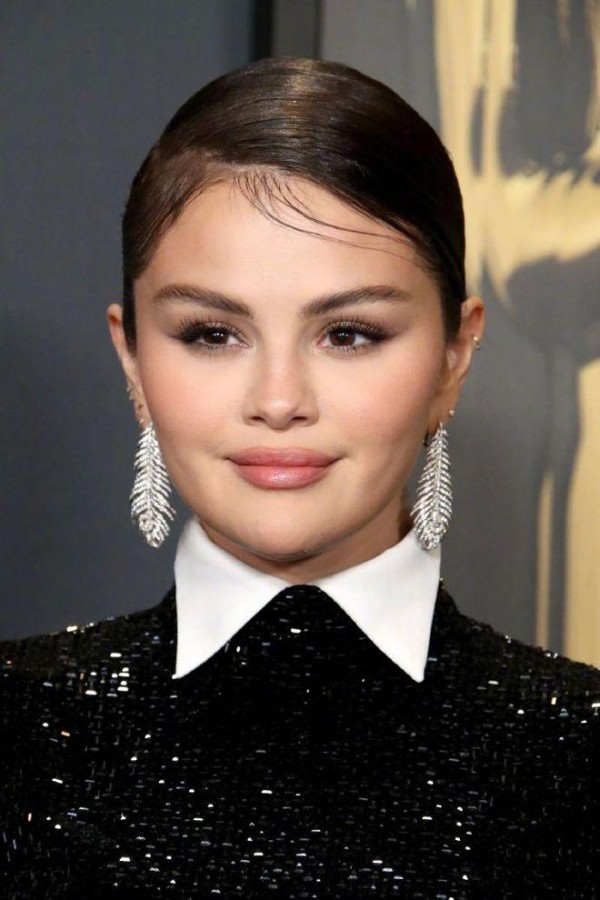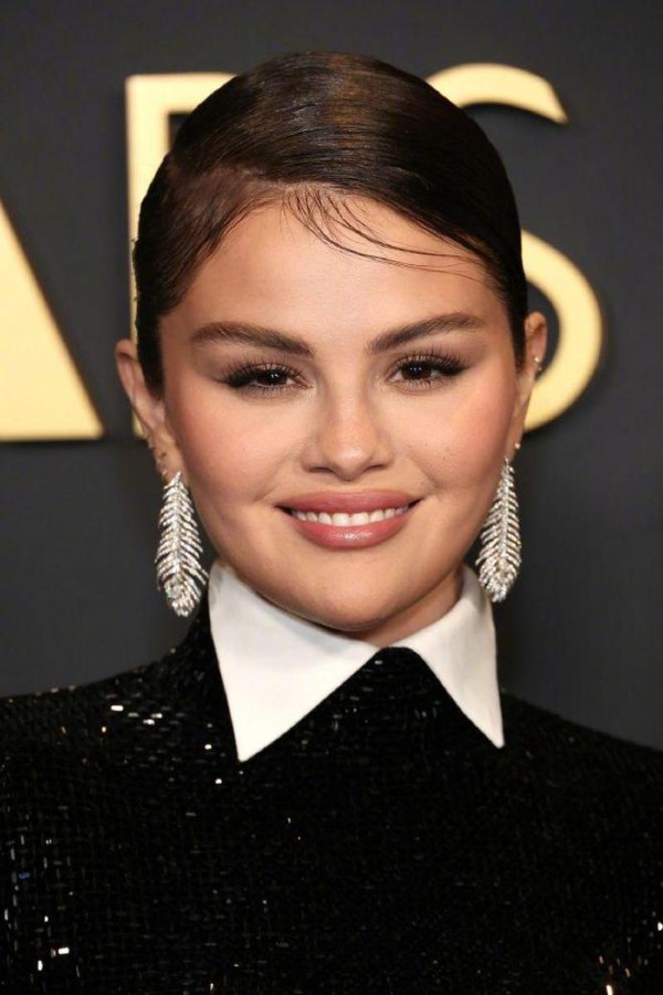 在妆容方面,赛琳娜选择了Rare Beauty打造的烟熏眼妆,深邃的眼影与她的黑色礼服相得益彰,让她的眼神更加迷人。同时,她将头发盘成光滑的发髻,露出清晰的面部轮廓,展现出她的精致五官。这种简约而不失优雅的发型与妆容,让赛琳娜的整体造型更加完美。