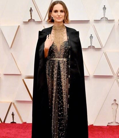 娜塔丽波特曼这一次的造型也非常漂亮,而且非常有心的是,她在自己的外披风边上绣上了很多女导演的名字,也是为这次没有一位女导演提名而感到有些生气吧,这些名字反而让外套看起来更加有个性了,内里穿搭的礼服颜色也与外套很搭。