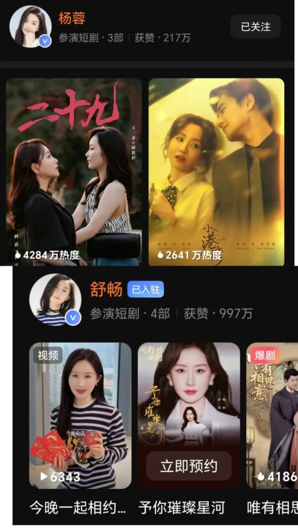 像舒畅、杨蓉的竖屏短剧,美貌在线,且能给到松弛有度的表演,提高剧集的质感。不过碰到真正的爆剧也不易,大部分长剧演员在红果上线的竖短,热度约在4000万左右,跟业内头部爆款有一定距离。