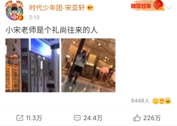 宋亚轩在逛街的时候发现有一个女孩一直在跟踪并拍摄自己,宋亚轩本不想理睬,但是此女孩有进一步的动作。宋亚轩拿起手机对着私生饭一顿狂拍,并在微博上挂了她,配文:小宋老师是个礼尚往来的人。