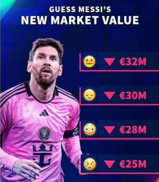 根据德转在2025年12月的最新数据,38岁的梅西身价从1800万欧元下调至1500万欧元,下跌了300万欧。 这个数字,已经是他职业生涯的新低,要知道他巅峰时期的身价曾高达1.8亿欧元。而33岁的孙兴慜身价也下调了300万欧元,从2000万欧元降至1700万欧元。 同样35岁的托马斯·穆勒,身价则从600万欧元小幅下调至500万欧元。