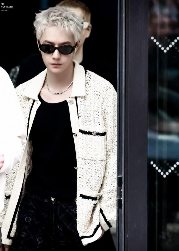 又比如 Métiers d'Art 纽约发布会上,他换上黑边白针织开衫加山茶花胸针和墨镜,专注看秀的画面里他显出一股少年感。这样的表达力让人相信他就是香奈儿在这条路上最稳定的代言人之一。