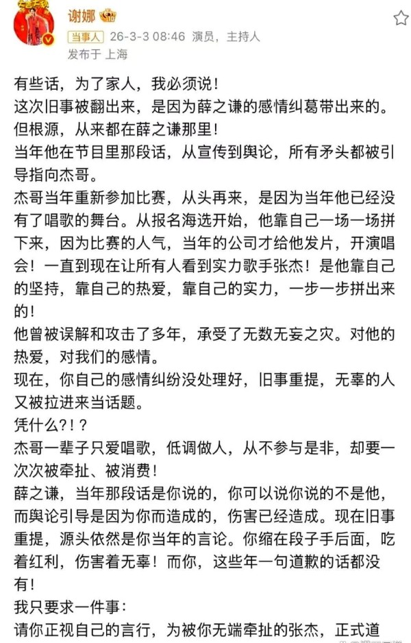 谢娜主动发声,要求薛之谦讲清楚。