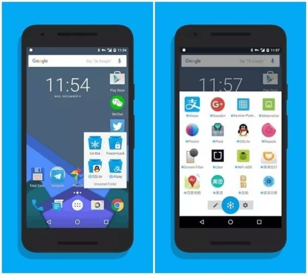 冰冻状态下的 App 也会从桌面隐藏掉。点一下冰箱里的图标,则会解冻并运行。锁屏数分钟后,又会自动冻起来。这样就可以有效的防止它们在后台偷电偷流量。