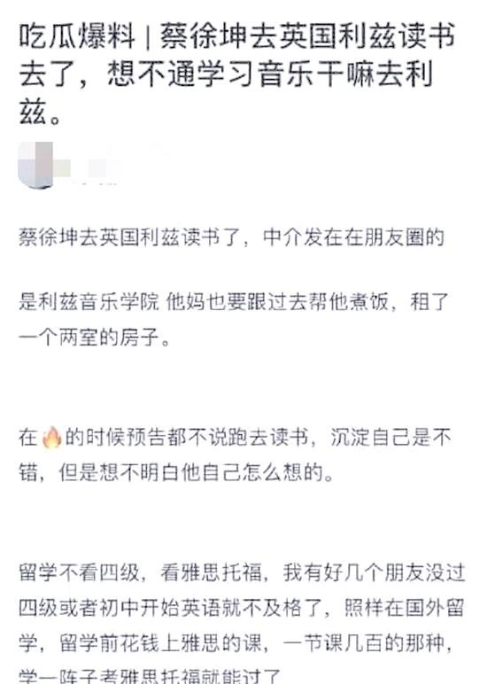 近日,有消息透露,蔡徐坤将暂别繁忙的工作,踏足英国利兹音乐学院开启求学之旅。据悉,该消息源于留学中介的朋友圈,并透露蔡徐坤的母亲将陪同前往,负责他的日常起居,目前已租下一套两室住房。