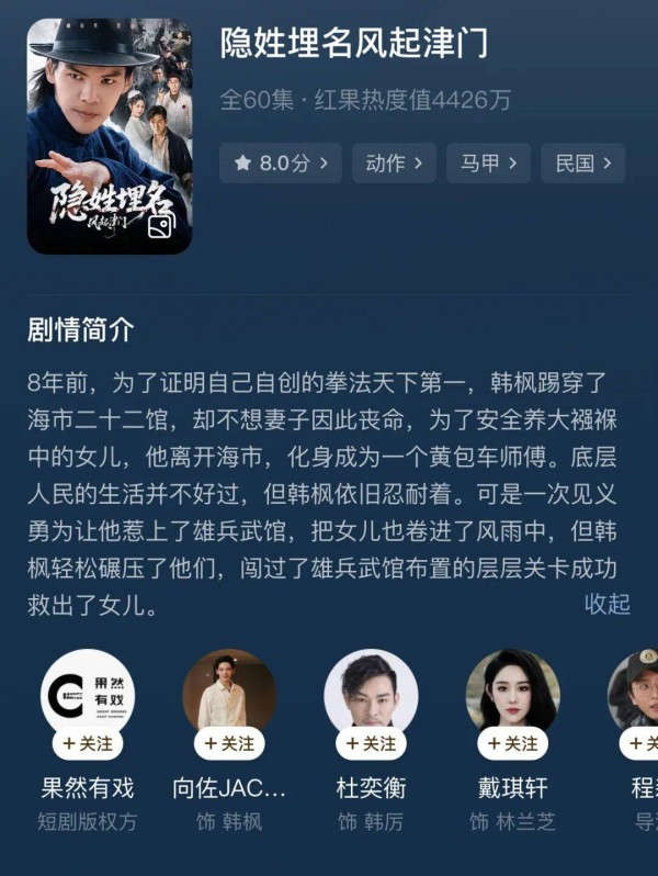 不过男频短剧的惯性就是闷声发财,一个更清晰的信号则是专业团队与动作演员的到来。李连杰高调客串《源力江湖》,向佐已经上了一部《隐姓埋名风起津门》。红果“果燃计划”的待播新剧《老兵归来之当打之年》由樊少皇主演,有吴京的影武堂参与。