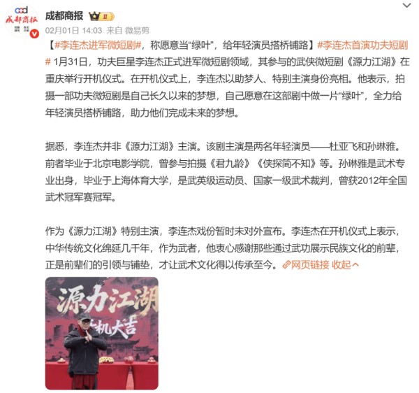 红果与李连杰、向佐的合作,可以说都是双向共赢,影武堂(吴京创办的动作演员训练基地,培养大批新人)的参与,令人浮想联翩。《扫黑》导演秦鹏飞此前深耕网络电影,是《东北警察故事》《目中无人》两个口碑系列的核心主创,他的试水或许也能说明:竖屏+动作,大有搞头。