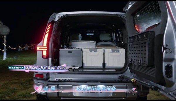 而在露营场景中,猛士M817的“全感豪华”更是直击心意,不仅常规后备厢容积达到同级最大的828L,将第二排座椅放倒后,更拓展出2.1米纵深的超级储物空间,在陆毅、鲍蕾夫妇到达露营现场时,不仅带来露营帐篷、野餐垫、食物等物资,而且在卸下重物时,150mm上下可调空气悬架会自动降低底盘45mm,无需费力举抬,细节处尽显贴心。