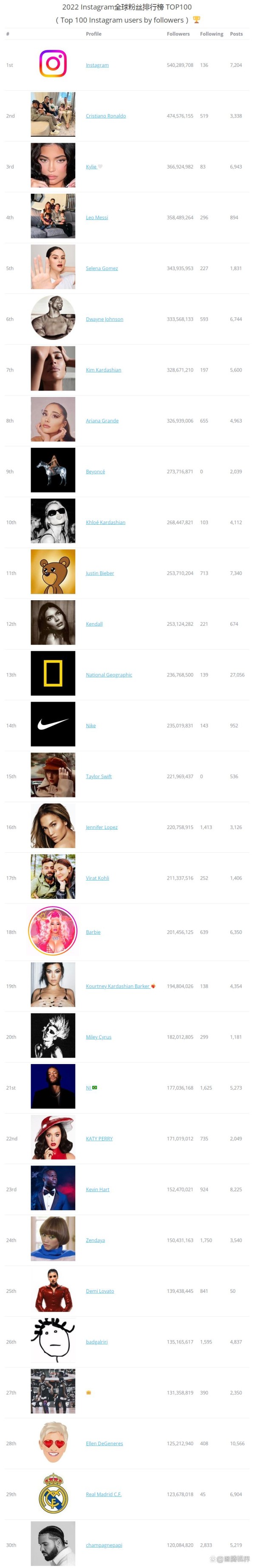 2022 Instagram全球粉丝排行榜 TOP100(Top 100 Instagram users by followers)