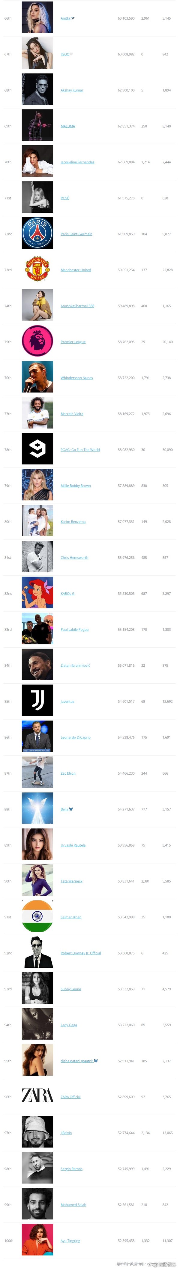 Instagram是全球网红明星达人的大型show场,集合了趣味、恶搞、时尚、生活、科技、美食、宠物、体育、娱乐、新闻、旅行、白富美、高富帅等等人间百态,拥有体育明星罗纳尔多、梅西、C罗、贝克汉姆、姆巴佩,社交名媛凯莉·詹娜,金·卡戴珊等,知名歌手Ariana Grande、LadyGaga、贾斯汀·比伯、Taylor Swift、碧昂丝等,明星演员道恩·强森、赛琳娜·戈麦斯、科勒·卡达珊等等,我们可以捕捉和分享世界的精彩瞬间。2022年,Instagram全球粉丝排名谁排第一,谁是IG顶流明星引领潮流,谁又是ins人气网红火遍全球,让我们看看最新的2022 Instagram全球粉丝排行榜 TOP100。