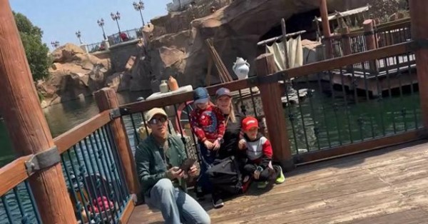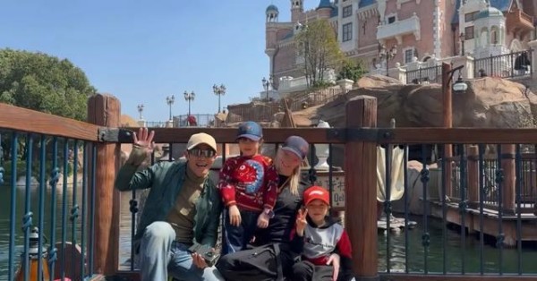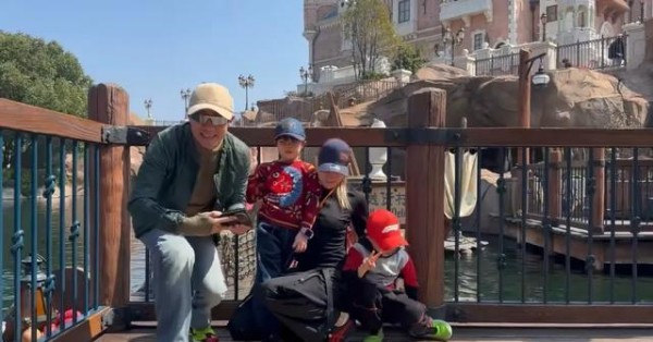 撒贝宁一家四口逛迪士尼 妻子和俩娃都是高颜值