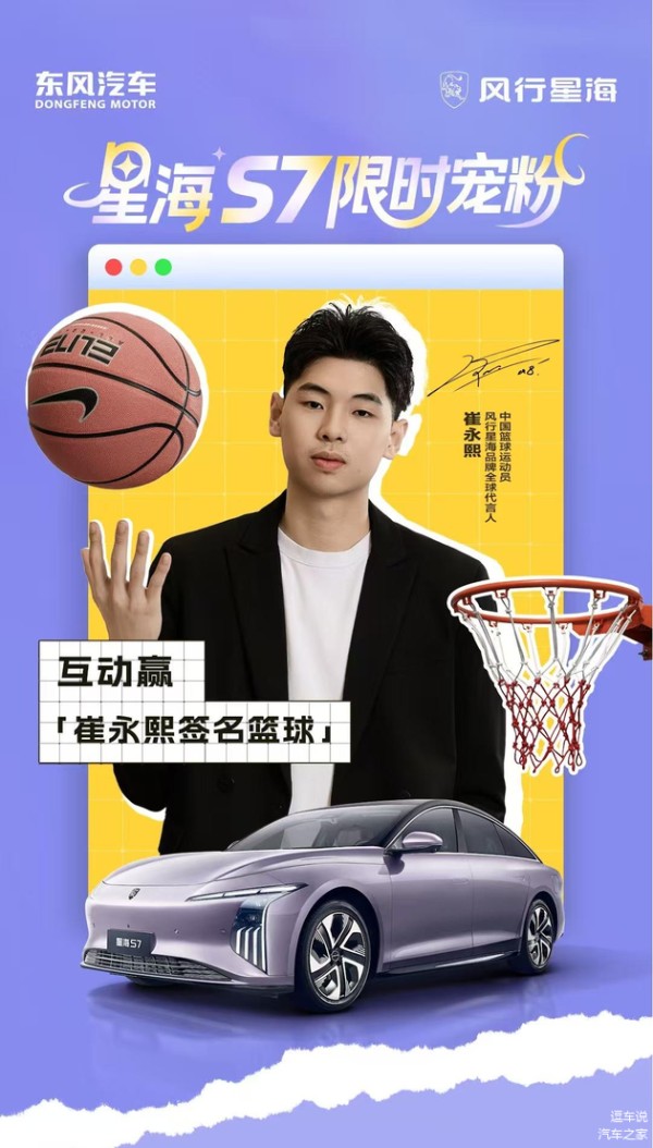 暑期向来是年轻群体释放活力的黄金时段,作为CBA新生代球星,崔永熙凭借敢闯敢拼的赛场风格与国际化视野,早已成为年轻一代的精神偶像,此次东风风行星海S7联动崔永熙,正是瞄准了年轻用户对运动、科技与个性化的追求。同时,崔永熙的篮球生涯也与星海S7的产品理念形成天然呼应,从CBA最佳星锐球员到NBA赛场的逐梦者,崔永熙始终以无畏姿态挑战极限,而星海S7则以全球最低 0.191Cd 风阻系数与11.9kWh/100km的同级最低电耗,重新定义纯电轿车的性能标准。