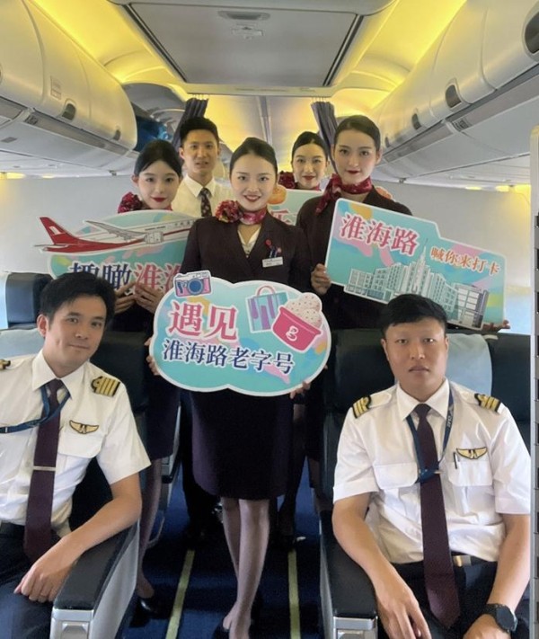 淮海路上有着光明邨、老大昌、老人和、丰裕等多家老字号,澎湃新闻记者从淮海集团获悉,乘坐上述主题航班的乘客,凭航班登机牌至淮海路可领取老字号伴手礼一份。同时,在老字号主题航班内,旅客在飞行中参与互动,有机会获得淮海路商圈准备的礼物。此外,8月9日至10日,“飞行主题老字号户外快闪”活动同步在淮海路商圈亮相。