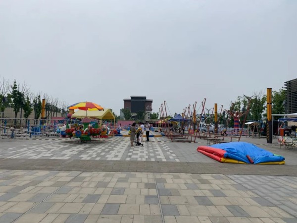 从空荡荡的地下停车场来到园区门口,小镇正门对面摆放了很多儿童娱乐设施,但周末的时间,只有一个孩子在家长的陪同下坐小火车。
