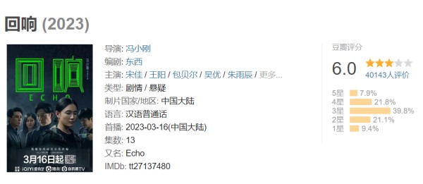 今年3月,不服输的冯小刚用一部情感悬疑双主线的《回响》再度冲击电视剧市场,虽说电影画面的质感俘获了不少观众,但是剧集里体现出的剧情逻辑及价值观硬伤,还是让这部剧集只获得了豆瓣6.0分的低分。