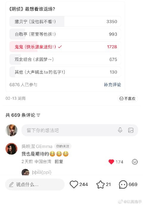 在《明星大侦探》走过近十年的历程后,一档综艺能沉淀下的情怀与人物羁绊,莫过于老观众对几位灵魂人物的念念不忘。其中,“鬼鬼”吴映洁的回归呼声,历经岁月沉淀反而愈发高涨。当她在2026年3月16日关于“最想看谁返场”的讨论中写下那句“我也是期待的!!!”,其评论迅速收获上万点赞与粉丝泪崩回复,这不仅仅是回应,更是点燃了无数老粉心中压抑已久的期待之火。这份跨越时光的强烈召唤,其背后深藏着多重无法替代的情感与价值。