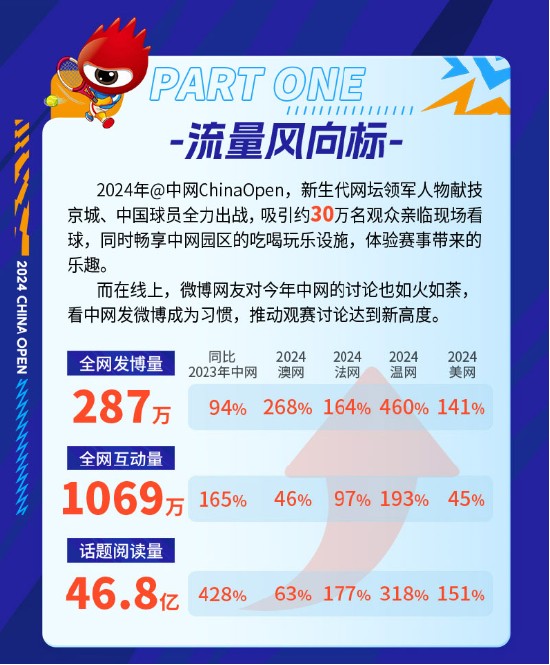 《报告》显示,本届中网期间,微博全网发博量达287万条,相比2023年中网增长94%;全网互动量1069万,相比2023年中网增长165%;话题阅读量更是高达46.8亿,相比2023年中网增长428%。