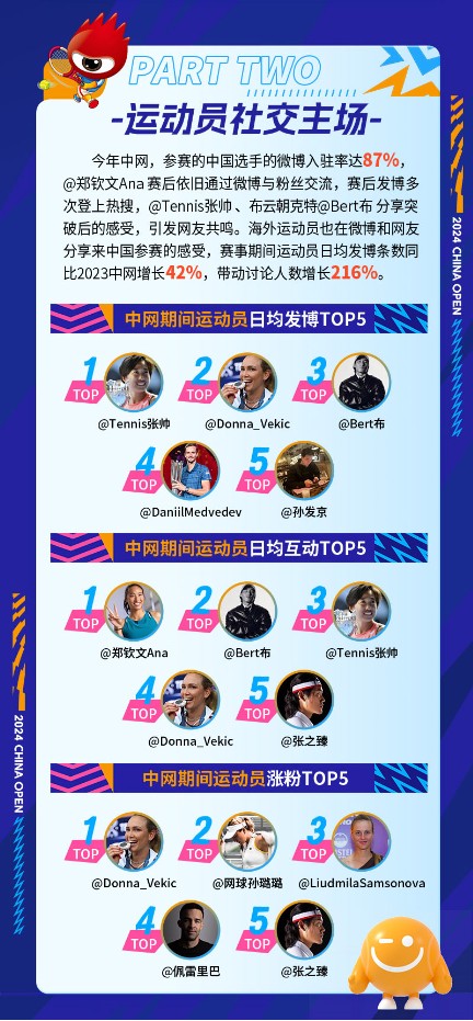 根据《报告》公布的相关数据,今年中网,参赛的中国选手的微博入驻率达87%,@郑钦文Ana 赛后依旧通过微博与粉丝交流,发博多次登上热搜,@Tennis张帅 分享突破后的感受,引发网友共鸣。