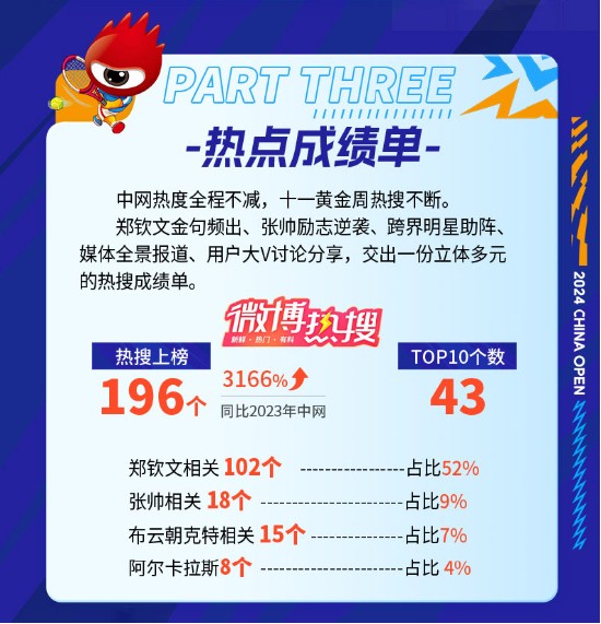 《报告》显示,本届中网共有196个话题上榜热搜,相比2023年中网增长增幅达3166%,其中,与郑钦文相关的热搜达102个,占比52%。