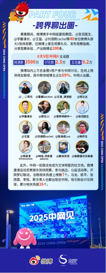 《报告》提到,微博站内上万名金橙V用户参与中网讨论,在线上陪伴网友聊球,其中跨领域博主占比69%。在大V们的共同努力下,2024年中网成功地 “火出圈”,其影响力得到了显著的拓展。