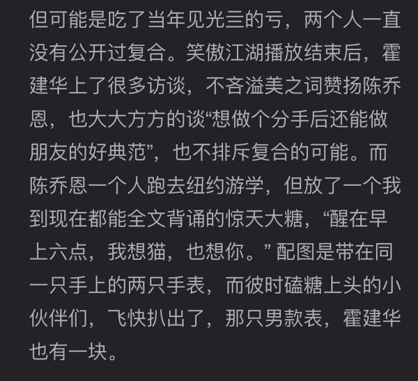 然后开始考古,知道这两个人十年前就因为千金百分百结缘,因为谈恋爱被发现,陈乔恩从女主变成了女二,小凤和韦翔也被拆cp。也许是为了事业,也许是产生了矛盾,总之两人分手,霍建华太过低调没有讲述过太多过往,但陈乔恩曾经写过几本散文集,隐晦地讲过过去的故事。时间有些久远我现在记不太清,但隐约记得她在分手后难过时还会走到男方家楼下,霍建华来内地发展后,她最难过的时候还打过一通电话,但后来也就断了联络。