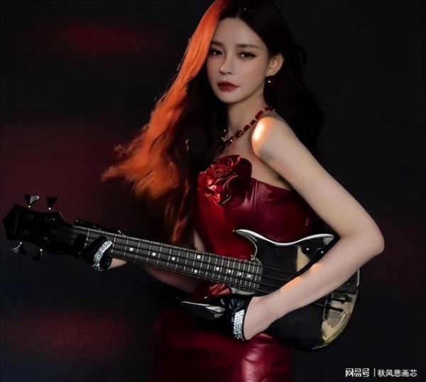 手里拿着吉他的时候,沈女士的摇滚范儿十足,再搭配上脖子上的红宝石项链,她就像是暗夜里的骑士。