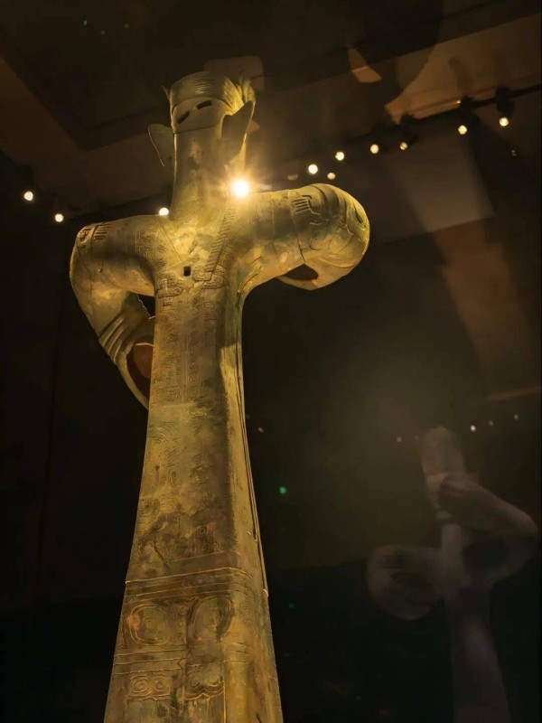 雕像铸造工艺精湛,身体中空的设计既减轻了重量,又体现了古蜀工匠对青铜材料特性的深刻理解。