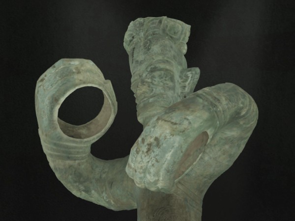 商铜立人像双臂抱握于胸前,双手巨大且呈环管状,但手中却空空如也。他原本握着什么?