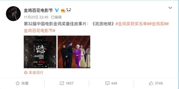 去年大热的科幻电影《流浪地球》获得最佳故事片奖。
