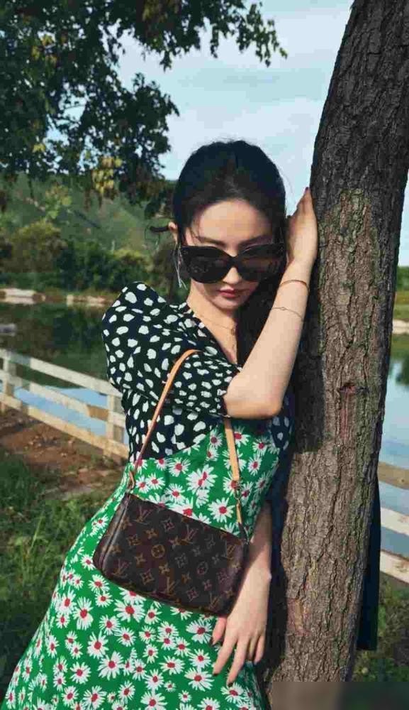 37岁刘亦菲又把丑衣服穿身上,土紫色花朵裙像一坨卷纸,不俗气反而很时髦