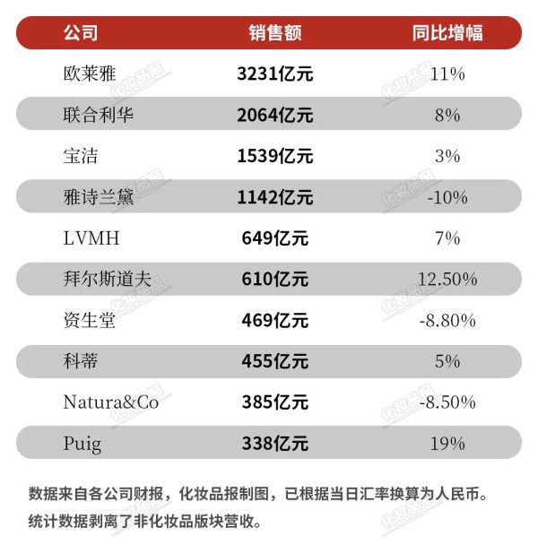 化妆品报梳理了全球各大美妆集团的财务报告,得出以下2023全球十大化妆品公司销售数据排行榜: