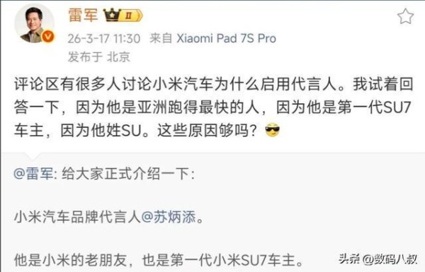 雷军一句“因为他是亚洲跑得最快的人,因为他是第一代SU7车主,因为他姓SU”,让小米汽车代言人的讨论瞬间破圈。三个看似简单的理由,实则是科技品牌与用户对话的范式革命:用速度符号锚定性能信仰,用车主身份激活用户共创,用文化梗构建情感共鸣。当汽车行业还在依赖流量明星制造声量时,小米正用“用户逻辑”重新定义品牌与消费者的关系——不是单向输出,而是让用户成为品牌故事的主角。