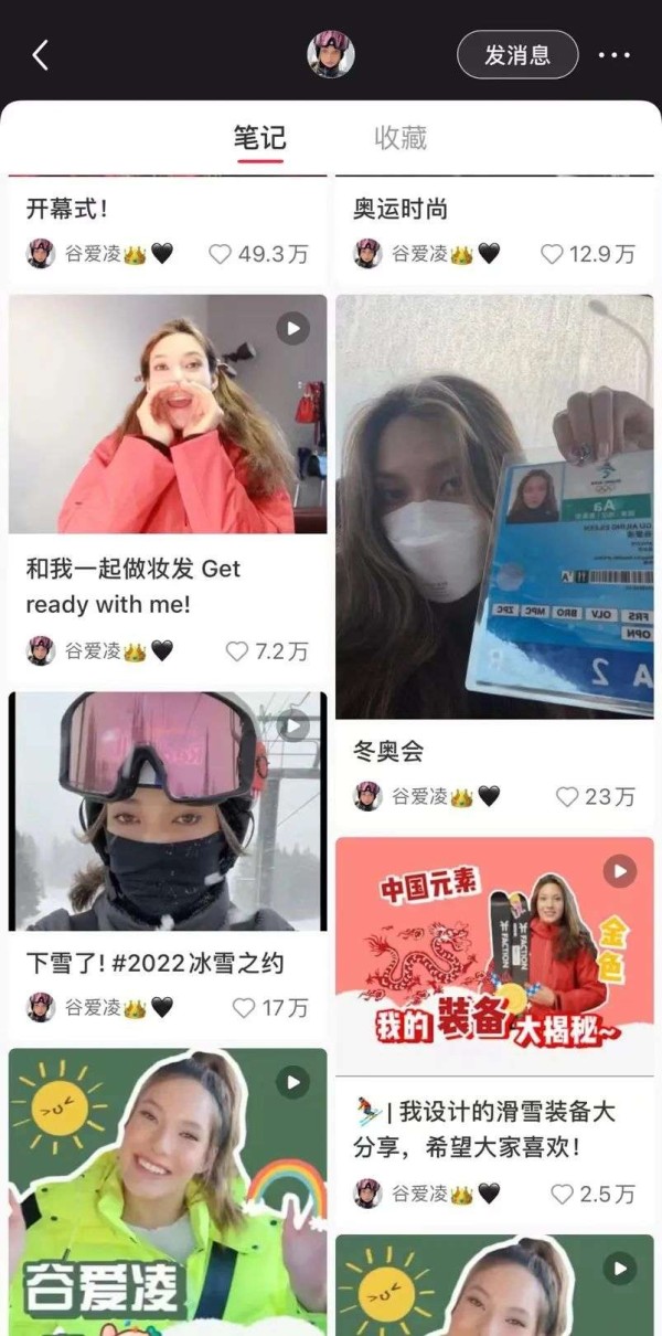 在小红书的谷爱凌又是另一种画风,体验沉浸式化妆、分享滑雪装备上自己的小设计。