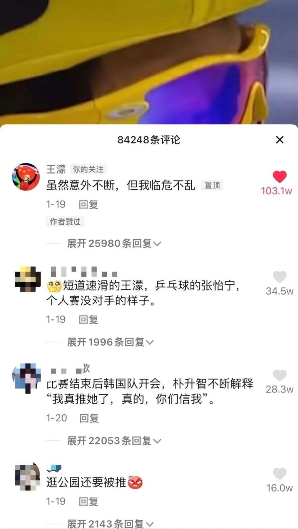 今年1月初,有抖音账号发布了王濛当年在索契世界杯短道速滑女子1000米比赛的视频,在被韩国选手推开,落后十几米的情况下,王濛奋起直追,在最后一圈上演惊天逆转拿下第一名。王濛在评论里调皮得写道:“虽然意外不断,但我临危不乱。”