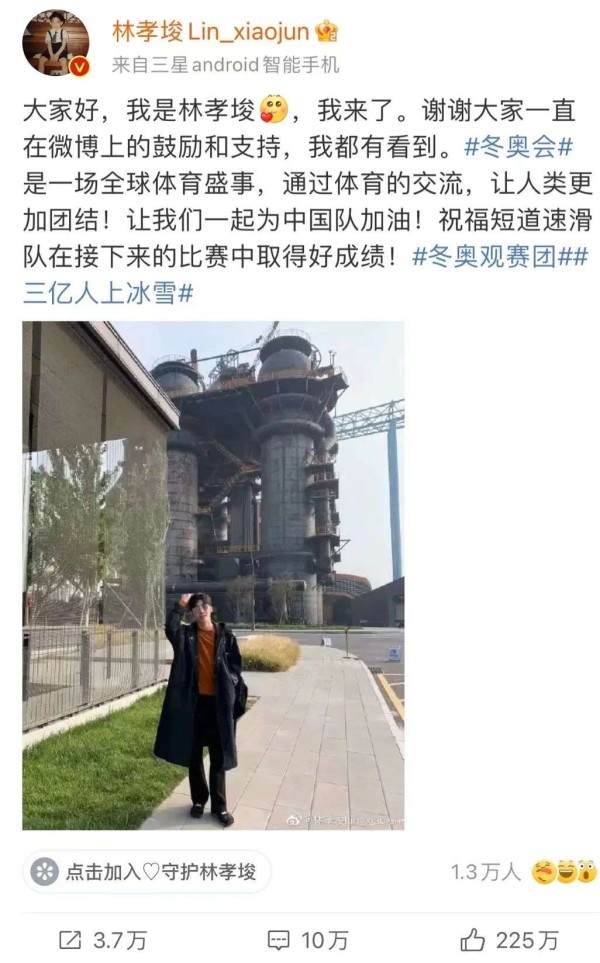 短道速滑运动员林孝埈入驻微博的首条微博就带了#冬奥会##冬奥观赛团##三亿人上冰雪#等话题词,微博发布不到一天,点赞量突破200万。