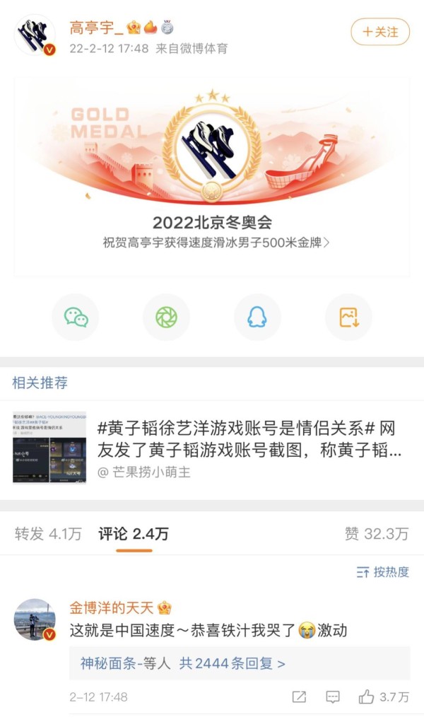 在高亭宇拿下速度滑冰男子500米金牌后,微博就在高亭宇自动发布了相关微博,花滑选手金博洋评论道“这就是中国速度~恭喜铁汁我哭了,激动”。