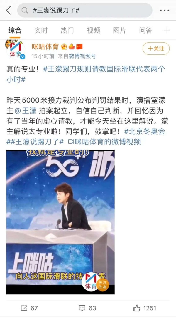 日前,话题“王濛说踢刀了”登上微博热搜榜,话题阅读量达3.4亿。这是因为在男子5000米接力半决赛中,李文龙摔出赛道,正当大家担心时,在咪咕解说的王濛却信誓旦旦地说这是踢刀了,肯定判进,结果果然如王濛所预料。之所以这么肯定,是因为她曾经历过同样的事情,并且向国际滑联技术代表请教了整整两个小时这种情况下的规则。