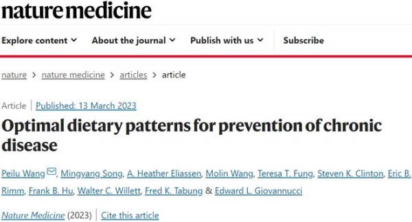 2023年3月13日,哈佛大学/复旦大学Wang Peilu等人在Nature Medicine(IF=87)在线发表题为“Optimal dietary patterns for prevention of chronic disease”的研究论文,该研究揭示了预防慢性病的最佳饮食模式。该研究对来自三个美国队列的205,852名医疗保健专业人员进行了长达32年的随访,前瞻性评估了两种基于机制的饮食和六种基于与重大慢性疾病相关的饮食建议的饮食,主要慢性疾病定义为发生重大心血管疾病(CVD)、2型糖尿病和癌症的综合结局。