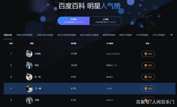 男星百科鲜花排行榜,王俊凯第四,王一博第二,肖战暂无对手2023年娱乐圈热度榜:王一博独占鳌头,肖战稳居第三