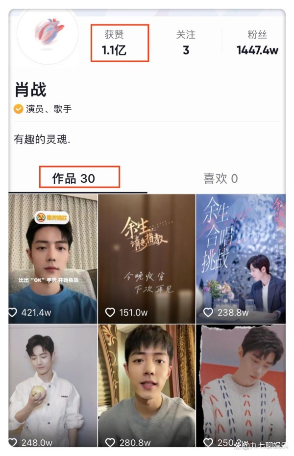 虽然肖战本人发布的作品只有三十个,但他的作品获赞量却达到了一定的高度,突破了1.1亿。从他的每一个作品数据来看都很可观,比如说点赞量、评论区留言以及转发量等等,能够直观地看到这些作品的受广大粉丝欢迎、喜爱程度。