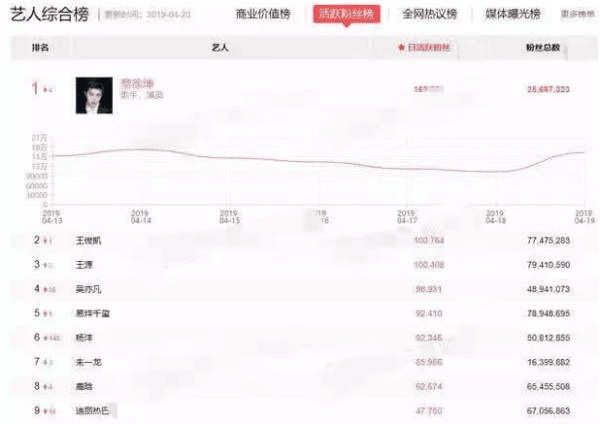 粉丝对于明星来说是非常重要的存在,如果一个明星没有粉丝,也代表着这不是个明星,艺人没有粉丝就相当于没饭吃,毕竟公众人物就是靠曝光来博取关注的,而且现在是一个流量化的时代,谁的热度高谁的话语权就大,也不管这个人是不是拥有这个实力,娱乐圈也越来越和之前脱轨,变成了一个商业的战场,而不是实力的较量。有网友总结了明星粉丝活跃度排行榜,热度最高的前十位男星: