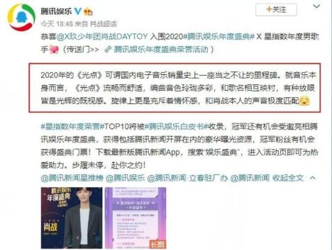 官方公布肖战年度成绩单,获年度十大人气歌手荣誉,《光点》上榜