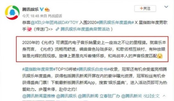 官方公布肖战年度成绩单,获年度十大人气歌手荣誉,《光点》上榜