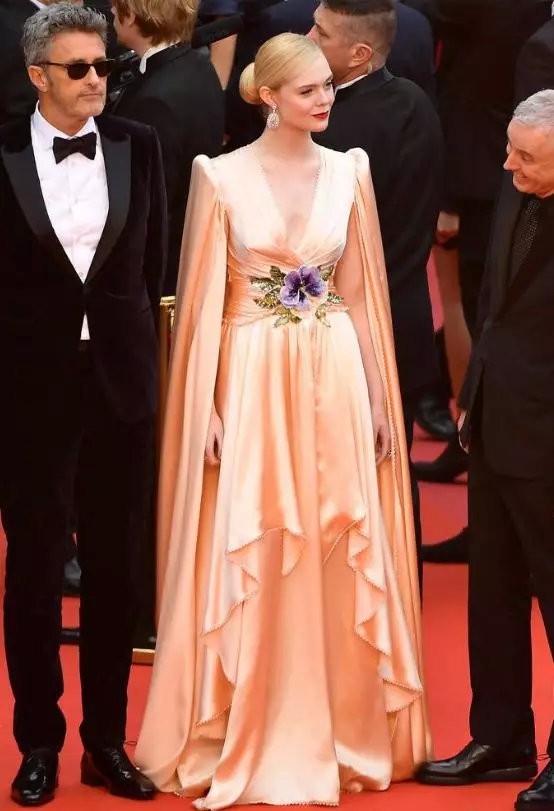 作为戛纳史上最年轻的评委,Elle Fanning这次的红毯造型选择了更加端庄大气的风格。香槟色深V礼服,肩部的立体设计提升评委的专业气场,腰部的三色堇花朵刺绣,还是彰显了这位98年生的女孩的少女感。