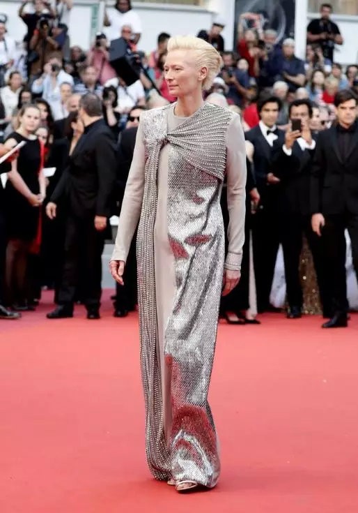 冰雪女王Tilda Swinton的红毯造型选择了一身银色的亮片铠甲,搭配利落的发型,仿佛化身冰雪女战士。